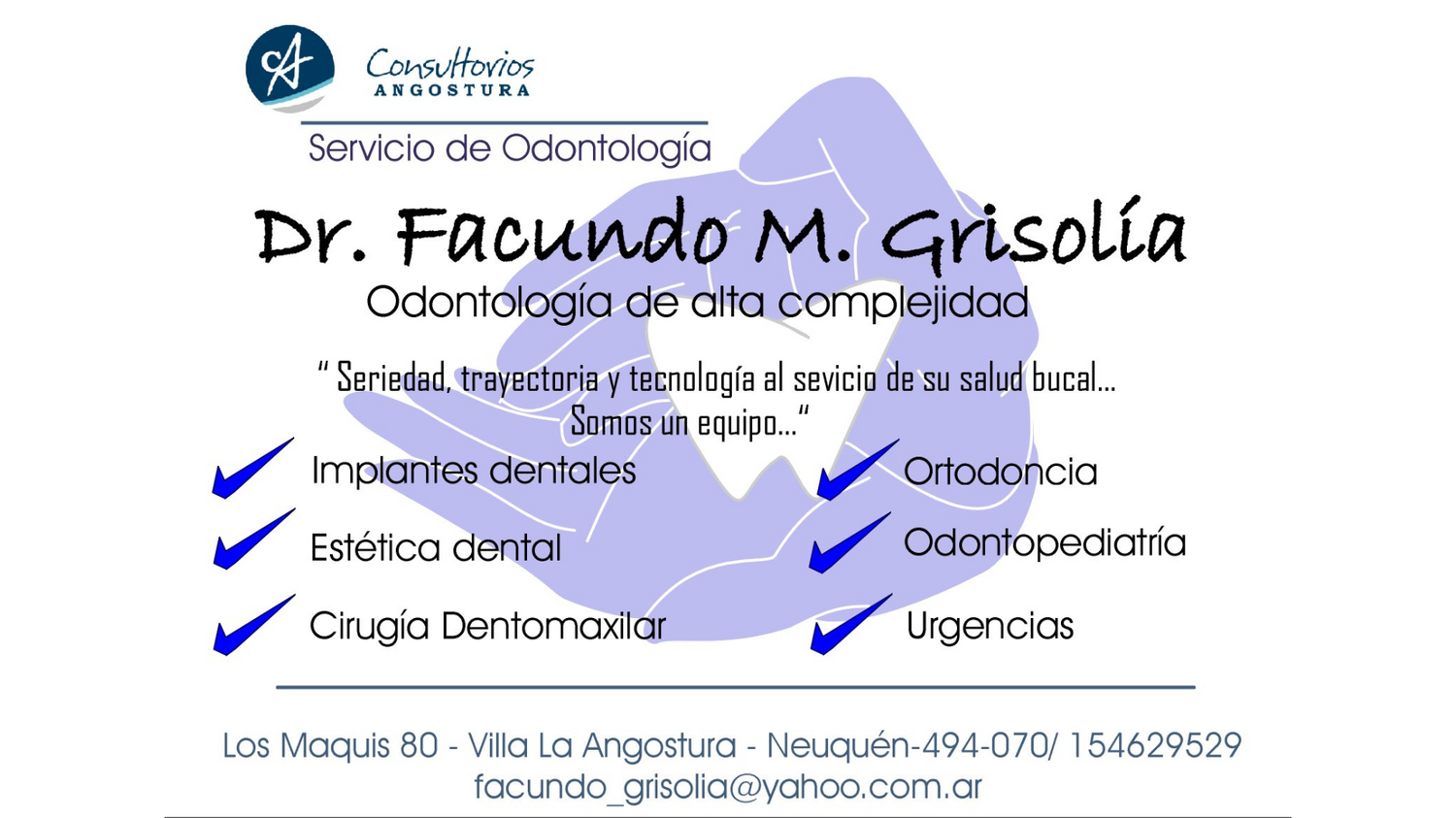 Odontología de alta complejidad – Implantes dentales – Estética dental – Cirugía dentomaxilar – Ortodoncia – Odontopediatría – Urgencias.